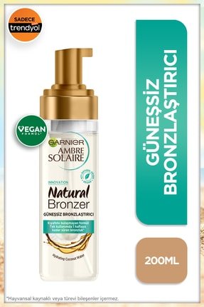 Garnier Natural Bronzer, ciltte doğal ve ışıltılı görünen bir bronzluk için %100 bitkisel kaynaklı bronzlaştırıcı etken ile zenginleştirilmiştir. %92 doğal kaynaklı içeriklerle zenginleştirilen ilk şeffaf dokulu Güneşsiz Bronzlaştırıcı Köpüğümüz tek kullanımda bronzluk etkisi sağlar. Hindistan cevizi suyu içeren formülü 1 haftaya* kadar süren doğal görünümlü bir bronzluk sunar. Yüz ve vücut için uygundur. Hızlı kurur. Hindistan cevizli yaz kokusu vardır.*Instrumental test