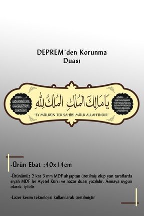Evin ve Bina Giriş Kapısı Üzerine Ya Malikel Mülk, El Mülkü Lillah Yazısını Arapça olacak şekilde yazıp asılırsa, Depremde Melekler o evi ve binayı koruma altına alır. Deprem selametle atlatılır diye ümit olunuz İNŞAALLAH 40x14 cm ebatlarındadır. Lazer kesim teknolojisi kullanılarak üretilmiştir